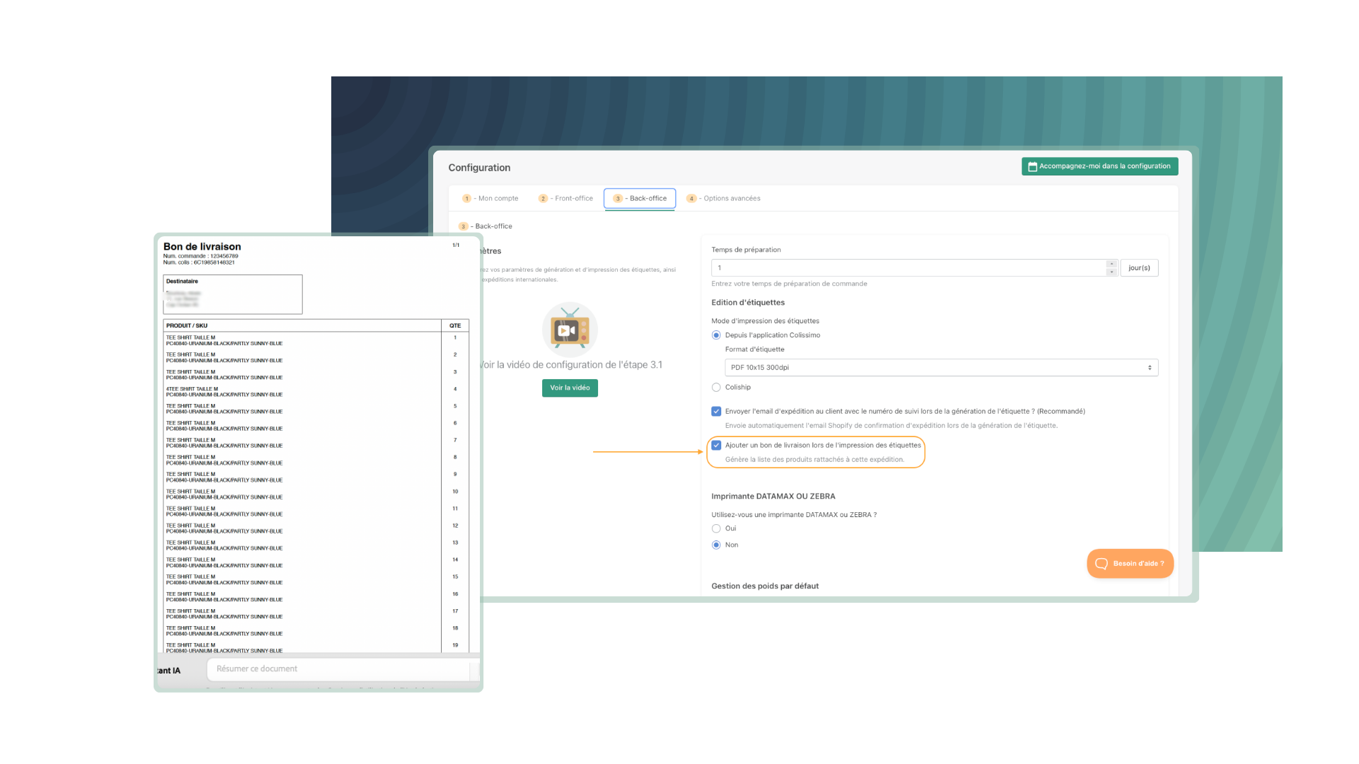 Depuis la configuration Back office de votre application Colissimo - Officiel sur Shopify, vous pouvez désormais activer la génération de bons de livraison pour fluidifier vos process de picking et de préparation de commandes.