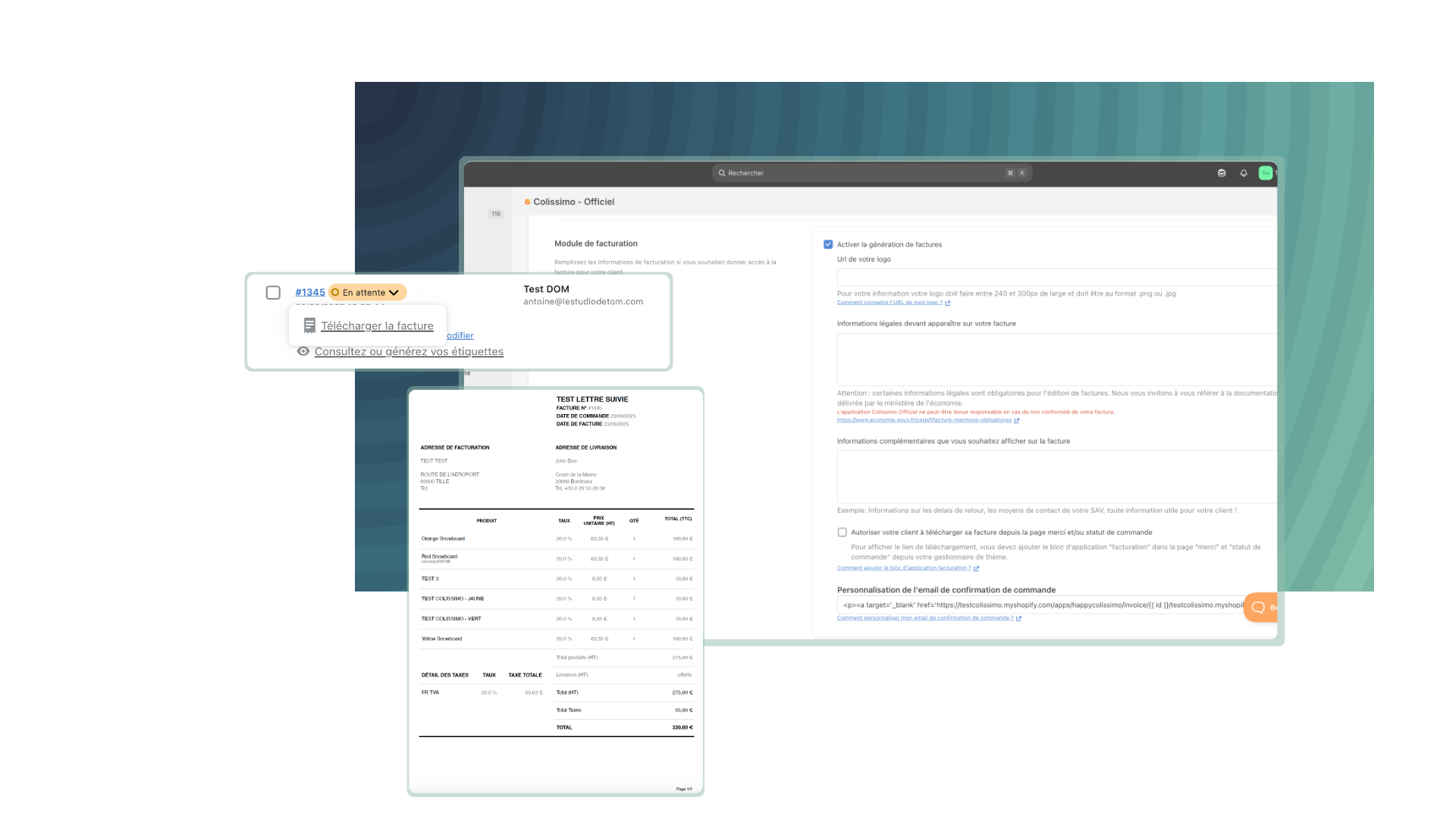 Nous avons intégré gratuitement un module de facturation afin de mettre à disposition de vos clients, leurs factures depuis la page de statut de commande et/ou de remerciement.
